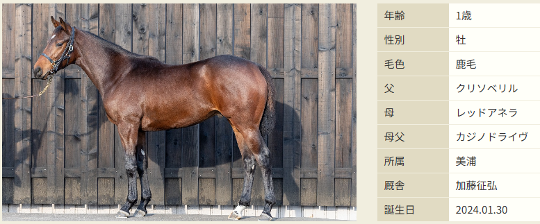 カタログでは印を付ける程度でしたが、動画での歩様と馬体にひとめぼれし出資。母の産駒は東サラ募集では全頭勝ち上がり(ビバーチェ除く)大きいところまでは手が届いていませんが安定、ダートと見ると牡馬なのは好材料にもなりうるでしょう。馬体からも仕上がり早なイメージを持っており2歳戦からの活躍に期待